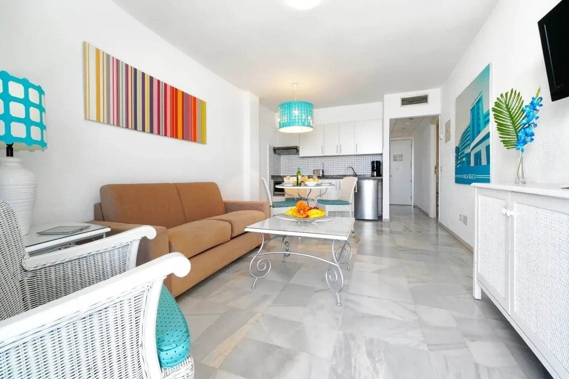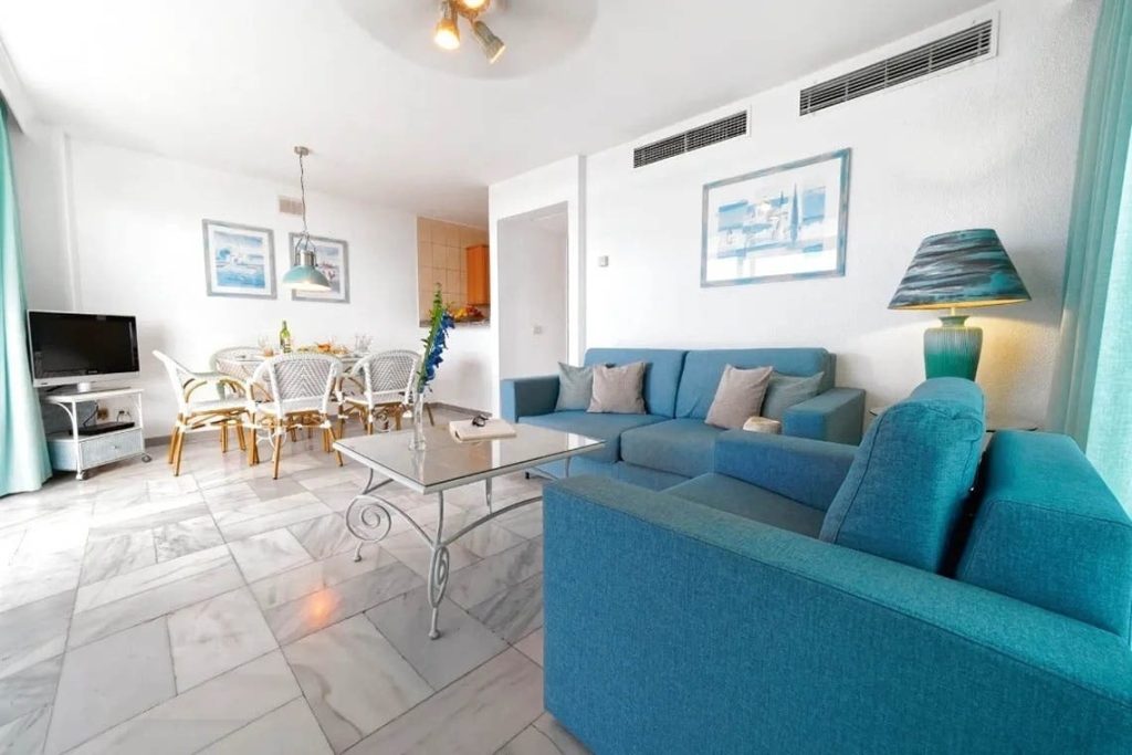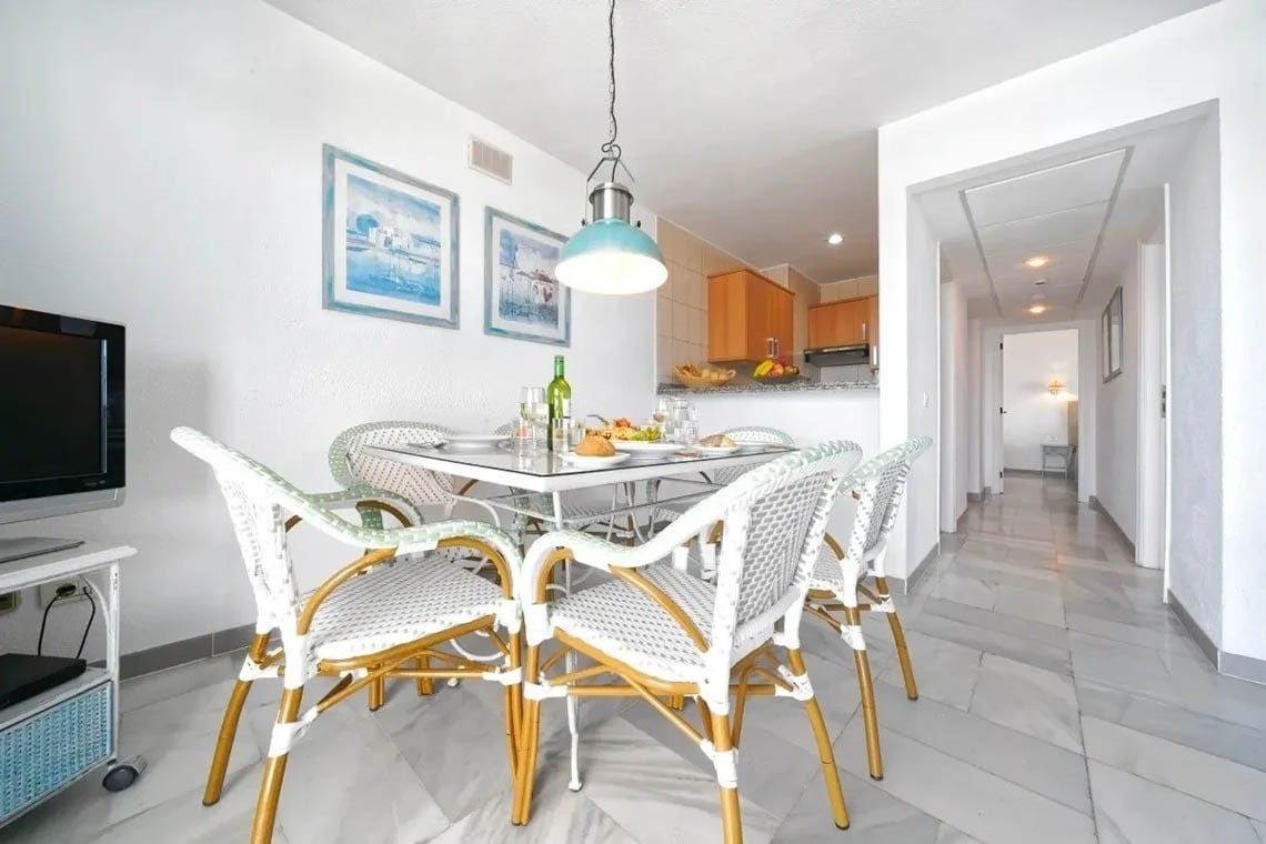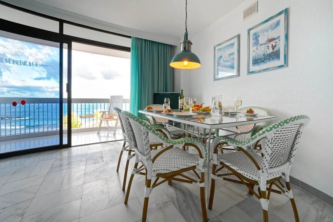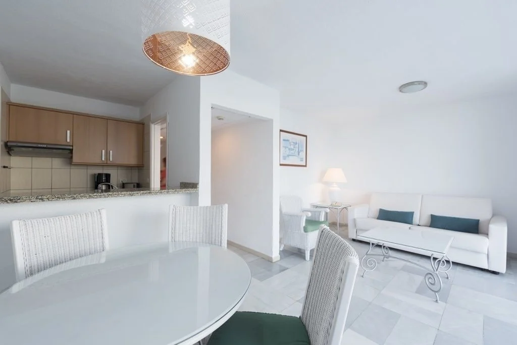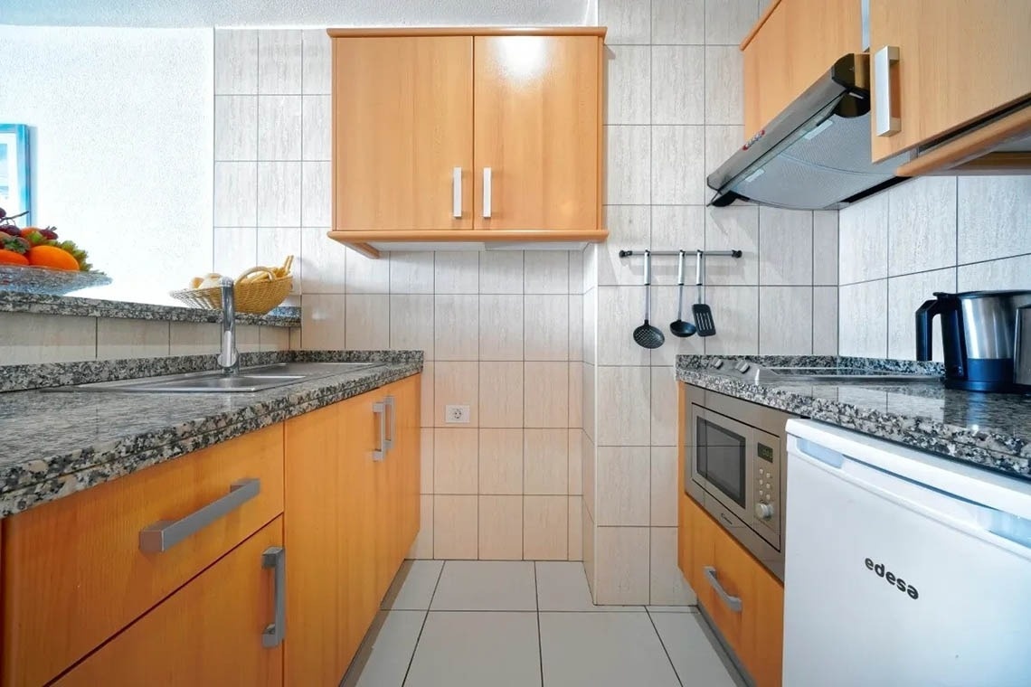 The modern and stylish décor, along with the natural light coming through the windows and terrace, creates a warm and welcoming atmosphere. The well-equipped kitchen and spacious living room make this flat an excellent choice for extended stays. Book now and reserve a flat with ocean views.